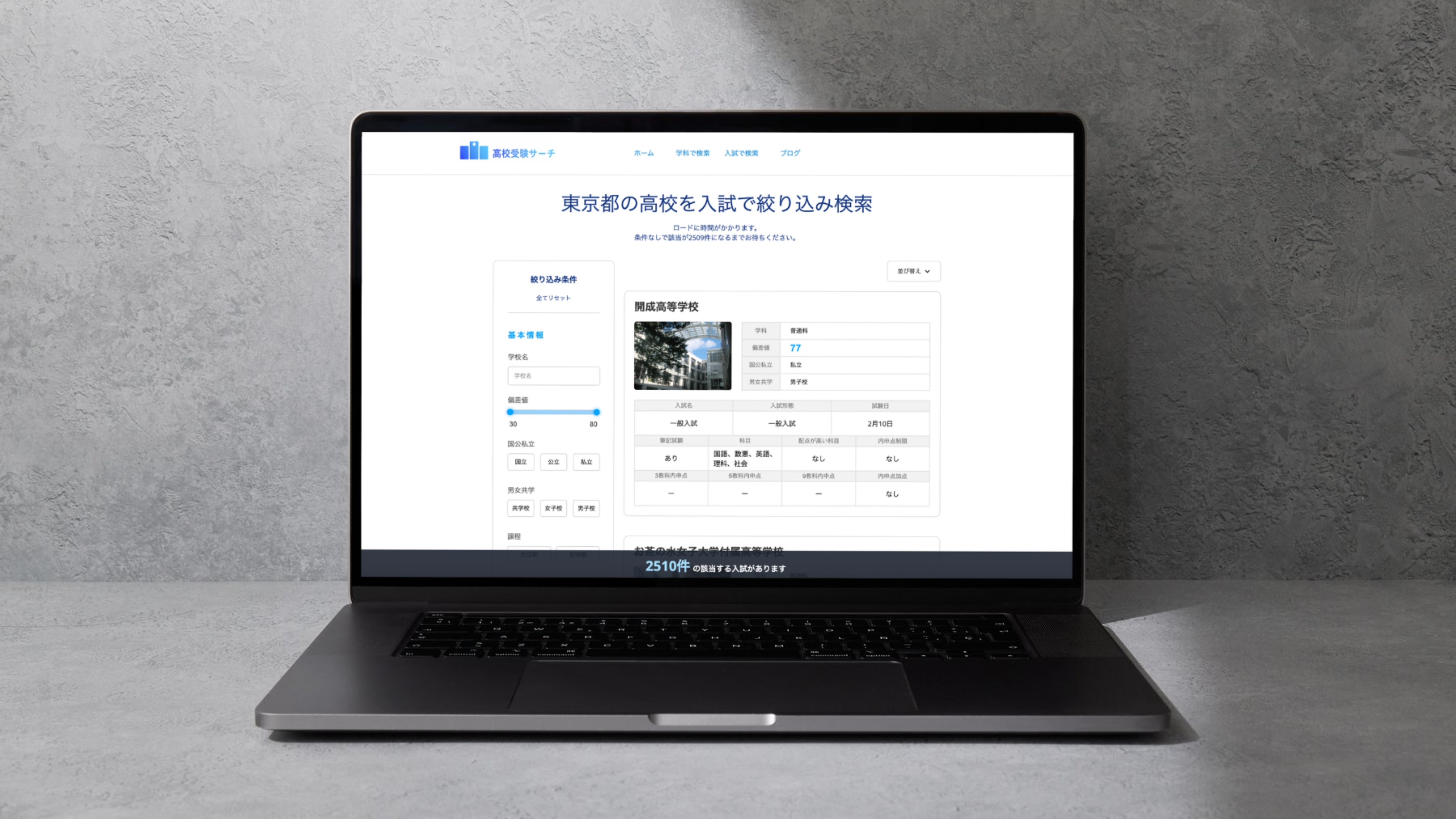 高校検索ウェブアプリ。CMSを様々な形式で絞り込む高度な検索機能付き。